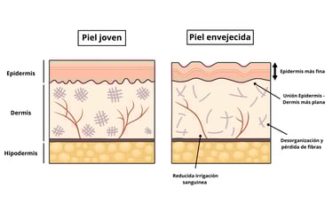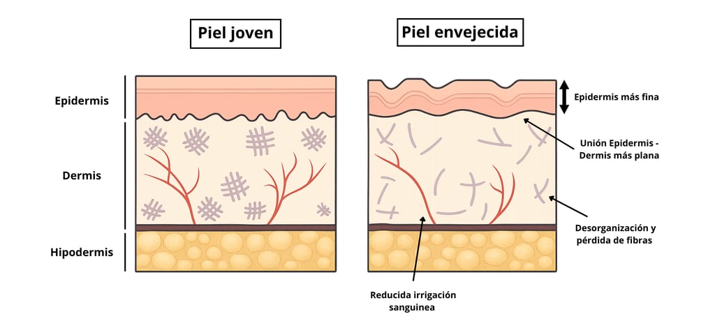 La primera en evidenciarlo es su superficie. En esa capa más externa —la epidermis—, los queratinocitos ya no se renuevan con el mismo entusiasmo. El recambio celular se enlentece y la capa externa adelgaza, perdiendo la capacidad de retener eficientemente la humedad. Como resultado, la piel luce más seca, menos luminosa y cicatriza con dificultad.