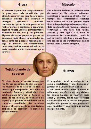 Todas las capas del rostro, desde los más profundo hasta lo más superficial, se modifican coordinada y progresivamente. Los huesos merma su densidad y volumen, la grasa se reacomoda o se reduce, los tejidos blandos descienden y la piel pierde elasticidad.